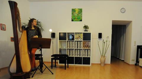 Die Harfenstube bietet ein angenehmes Ambiente und Raum zum Harfe Ausprobieren, Lernen und Spielen.